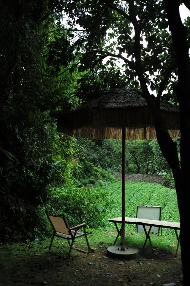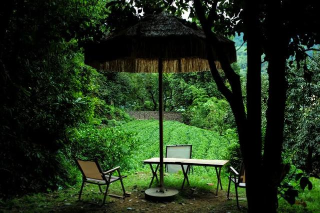 后院设计了一个小露台,面向大片茶树,满眼都是绿色。