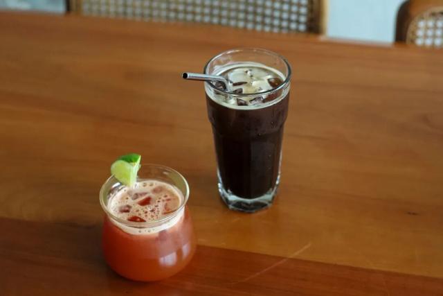 推荐樢咖啡的手冲,选个自己喜欢的豆子,对着青山白云慢悠悠地喝一壶。不喜咖啡的朋友可以试试番茄冰柠茶,清爽解暑的夏日饮品。