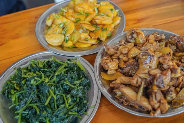 红烧土鸡,老鲍农家乐的招牌,确实好吃,每一块鸡肉都是油亮的,又嫩又入味。炒小土豆也强推,口感粉糯,是道下饭的碳水菜。