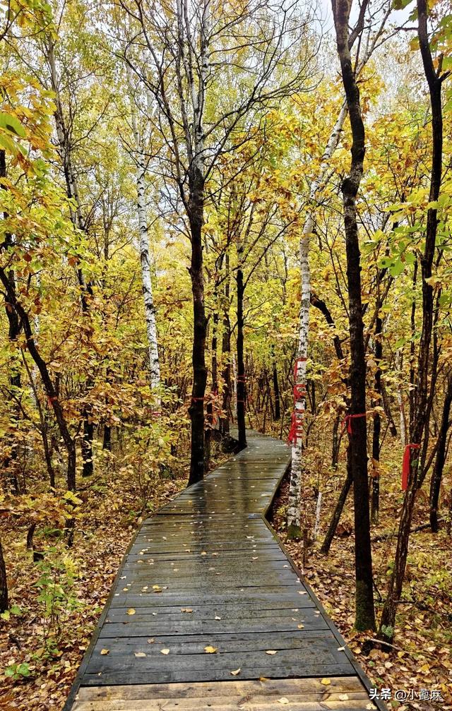 游人不多,先坐观光车到达木制栈道入口,小雨中的白桦树极美,白色的树干,红色的福带,黄色的叶子,浠沥沥的雨声,鞋踏在栈道及叶子上发出的沙沙声,湿湿的空气,草的气息,一切的一切都是那样刚刚好。