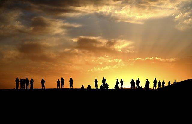 2025年10月2日清晨,游客在甘肃省敦煌市鸣沙山月牙泉景区观赏大漠日出美景。新华社发(张晓亮 摄)