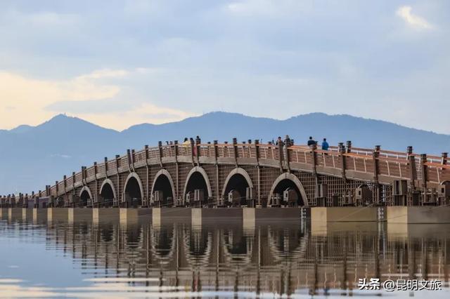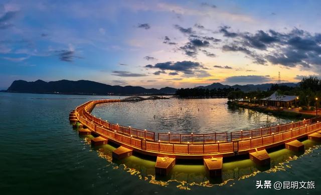 站在浮桥上,向西欣赏西山“睡美人”风姿,向东眺望滇池大坝风光,城市与山水在此完美同框,日景夜景皆宜。