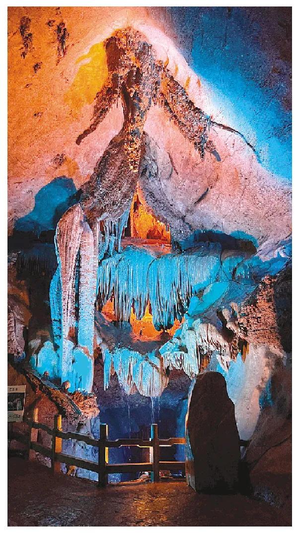 值得一提的是洞内一处水潭的设计,岩洞上方的钟乳石倒映在平静的水面上,形成“石在水中生”的奇幻视觉效果。沉心观赏,水中的钟乳石映像与实景交相辉映,深邃又灵动,让人仿佛坠入秘境,沉醉其中。