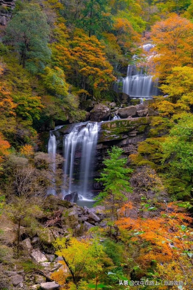 若说红尘峡是“静美”,那枫林瀑布便是黎坪秋日的“灵动担当”。沿着步道往山谷深处走,远远就能听见水流撞击岩石的清脆声响,走近才见一条银练从山间倾泻而下,水雾在阳光下折射出细碎的光斑。