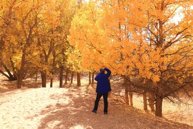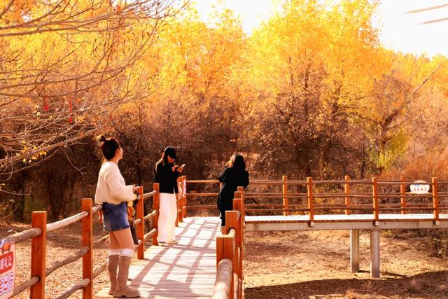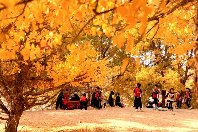 近日,位于张掖市高台县的九头胡杨林景区内,胡杨林换上了金色的盛装,进入最佳观赏期,连绵起伏的沙丘上呈现出一片金色长廊,胡杨、大漠、河流相映生辉,吸引各地游客前来观赏。研学旅游的孩子们在树下沙丘上嬉戏玩耍,欢声笑语在景区回荡,为这片静谧的胡杨林增添了无限生机与活力。