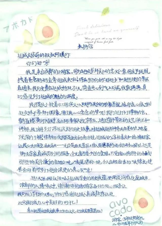 在来自全国各地游客的好评中,成都五年级学生胡起凡的手写表扬信,与一面“文旅惠民暖人心 好客运城赢赞誉”的锦旗,格外引人注目!