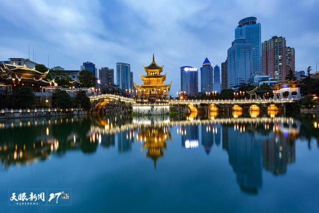 最难忘远眺甲秀楼那一带的秀色!那是在现代城市高楼的天际线下,一条横卧南明河上曲线优美的秀色,是远方的甲秀楼坐拥身下的长桥,白日横逸在天蓝水碧、烟柳明花间,带给你一脉盈盈的清秀,抑或是夜晚融入灯火斑斓、光影陆离中,带给你一抹梦幻般的艳秀,让你铭心刻骨,遐思无垠。