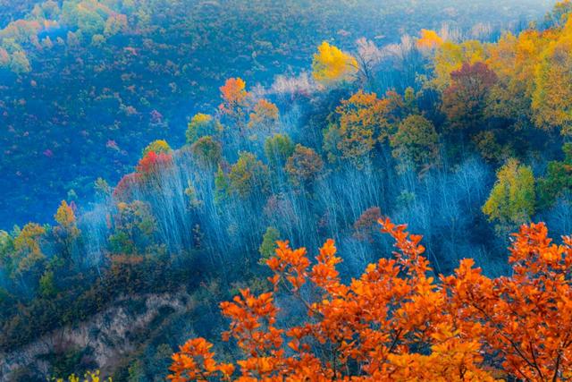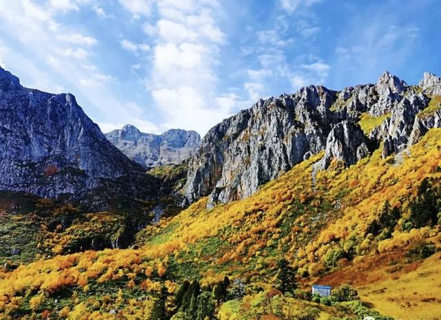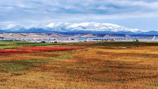洁白的雪线与山间金黄、赭红的秋林相互映衬