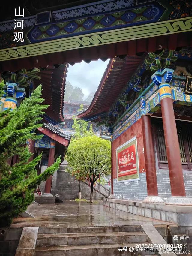转入山径,一座红柱蓝瓦、飞檐翘角的拱门迎面而来,门前列石狮镇守,木台青石映着湿漉漉的晨光,正是山河观入口。此地原名山河祠,始建于宋庆历年间,为祀汉相萧曹而立,2008年重修后成为当地规模最大的道教场所,内有三清、龙王、土地诸殿,香火虽未盛,却自有庄严肃穆之气。