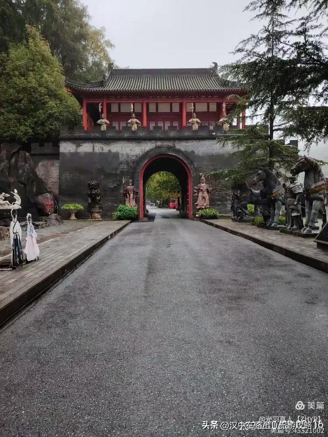 拾级而上,殿宇层叠,彩绘斑斓,金纹饰柱在阴云下依旧熠熠生辉。一棵黄叶树斜倚廊前,似在低语秋声。远处汉王刘邦与丞相萧何、大将韩信的高大雕像巍然,三人并立,衣袂庄严,仿佛重现昔日贤臣共治的气象。介绍牌上字迹清晰,道尽此地沧桑变迁,令人驻足良久。