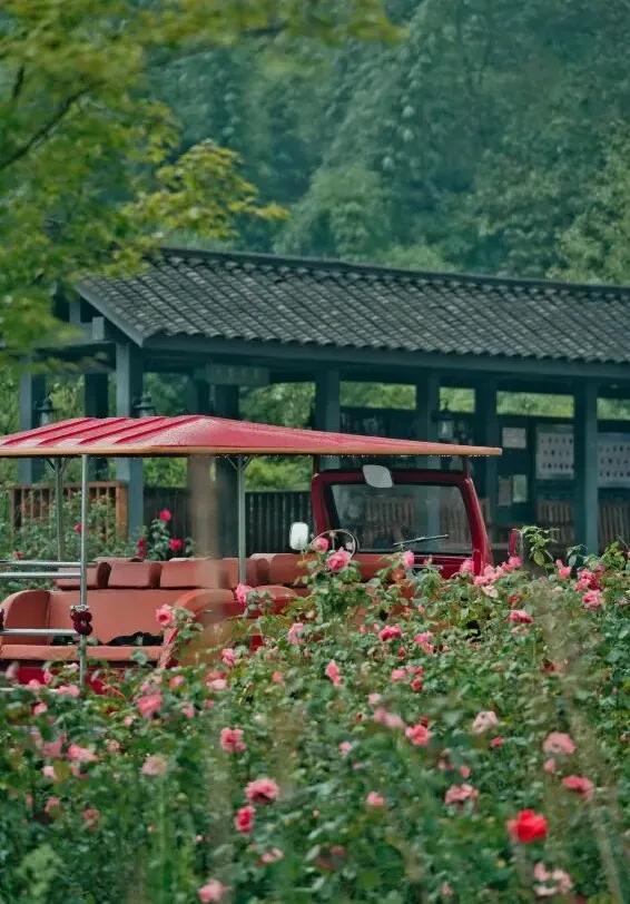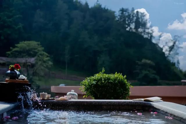 温泉水热气蒸腾,窗外是郁郁葱葱的山景与点缀的野玫瑰——即便不在盛花期,那满目绿意也足以让人心静。
