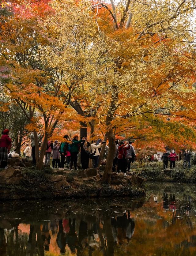 秋天的秋霞圃最美,当满园的枫树和银杏叶在秋风中变红变黄,阳光透过枝头将光影倒映在池塘上,形成一幅五彩斑斓的水墨画。