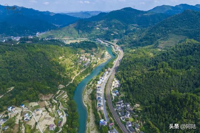 航拍视角下,河边村庄的梯田和蔬菜(水果)大棚不仅规模壮观,一层层一片片以不规则的形态分布在民居四周,远远望去竟然还挺好看。