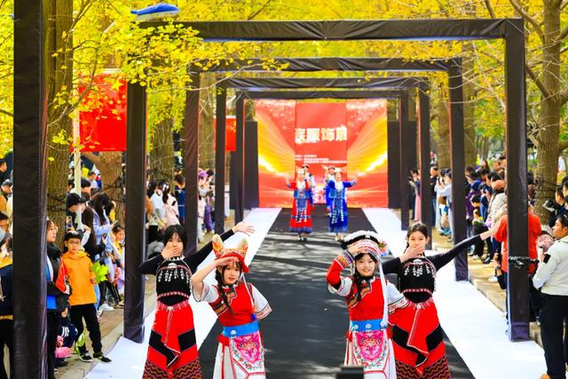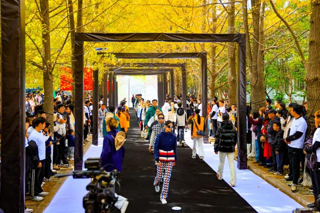 学生模特身着创意服饰翩然前行,衣袂与落叶共舞,留学生们身着各国传统服饰加入展演,多元文化与鎏金秋色交织成流动的画卷。