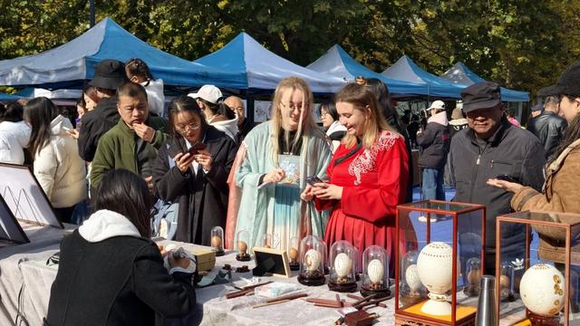 银杏大道上,人流如织。艺术学院与纺织服装学院的展区内,辽宁省国潮文化应用设计大赛作品引人驻足,传统纹样与现代设计碰撞出创意火花;一旁的非遗印染体验区,游客亲手尝试蓝染工艺,感受“染韵承薪火”的匠心传承。