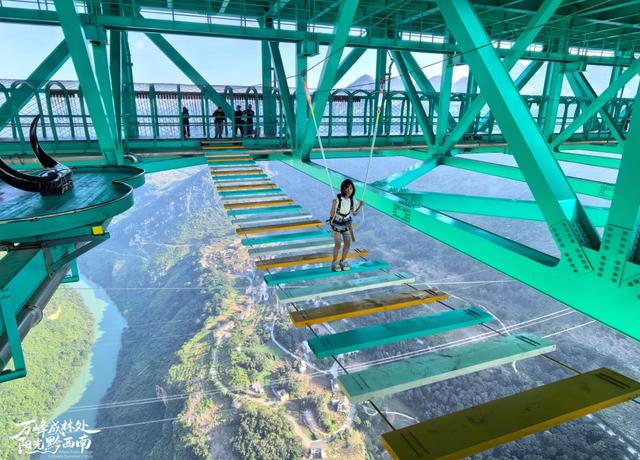 游客在花江峡谷大桥体验“步步惊心”项目。(图/肖月娥)
